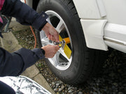 Simply hooks through the caravan chassis and then passes through the wheel and is locked by an ultra high-security lock. Prevents movement of the Caravan and rotation of the wheel.